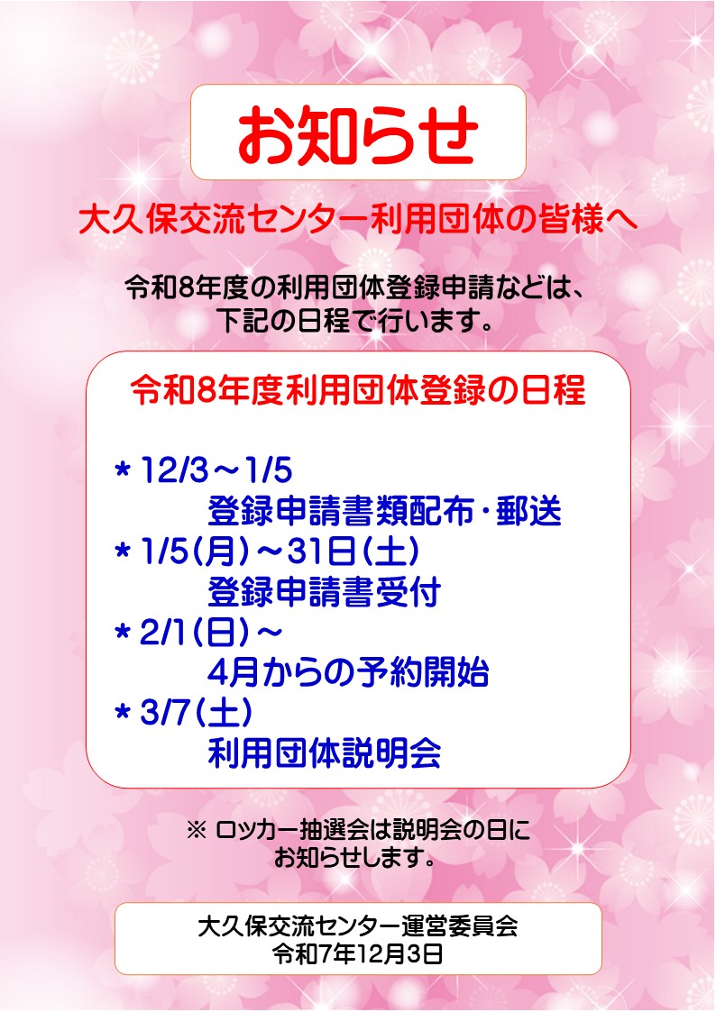 お知らせ ホーム > お知らせ一覧 > イベント・募集 > 【交流センター】令和8年度利用団体登録について イベント・募集 202512.03 【交流センター】令和8年度利用団体登録について 前の記事へ イベント・募集一覧にもどる