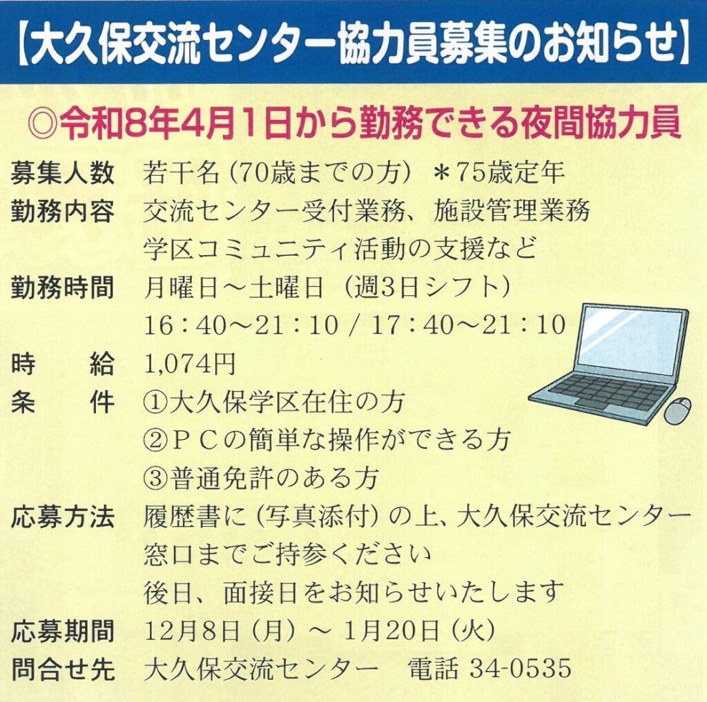 お知らせ ホーム > お知らせ一覧 > お知らせ > 【交流センター】協力員募集のお知らせ お知らせ 202511.24 【交流センター】協力員募集のお知らせ 前の記事へ お知らせ一覧にもどる 次の記事へ